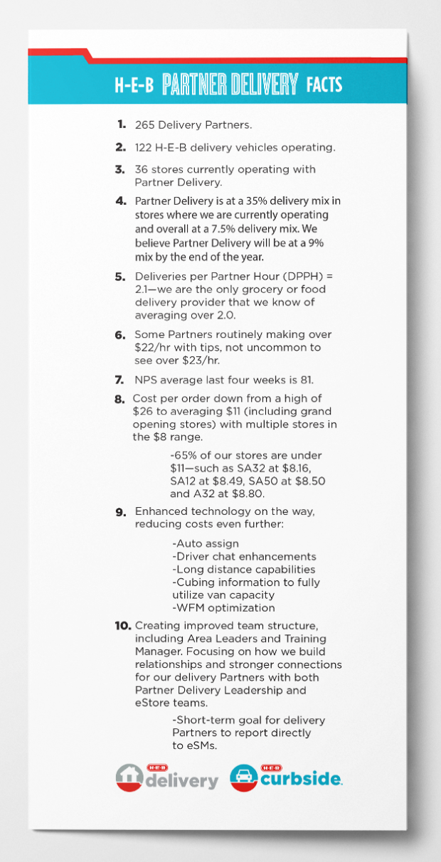 Information card for curbside meeting that displays facts about H-E-B Curbside and Partner Delivery.